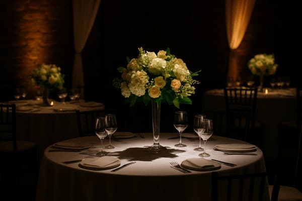 Uplighting is a decorative lighting technique used in event design to enhance ambiance and highlight architectural features. LED lights are placed on the ground and aimed upward to cast a colorful glow on walls, columns, or drapery. This adds depth and elegance, transforming spaces for weddings, parties, and corporate events.