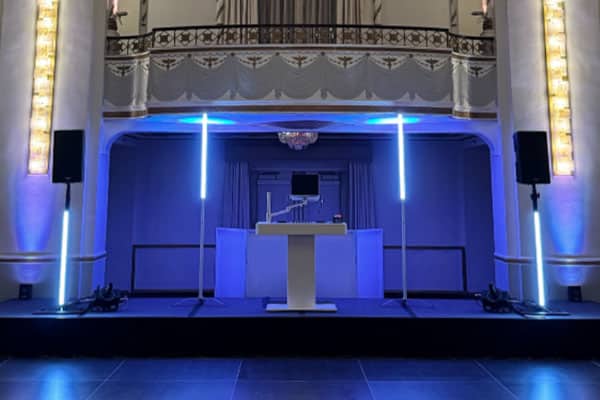 Stage/Dancefloor Lighting uses colorful spotlights, moving lights, and beams that sync with music to energize the event space. Often mounted above or around the stage, these lights enhance performances and excite guests. Ideal for parties and concerts, this lighting adds rhythm and energy while matching the event’s theme and mood.